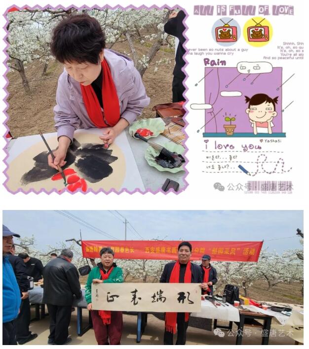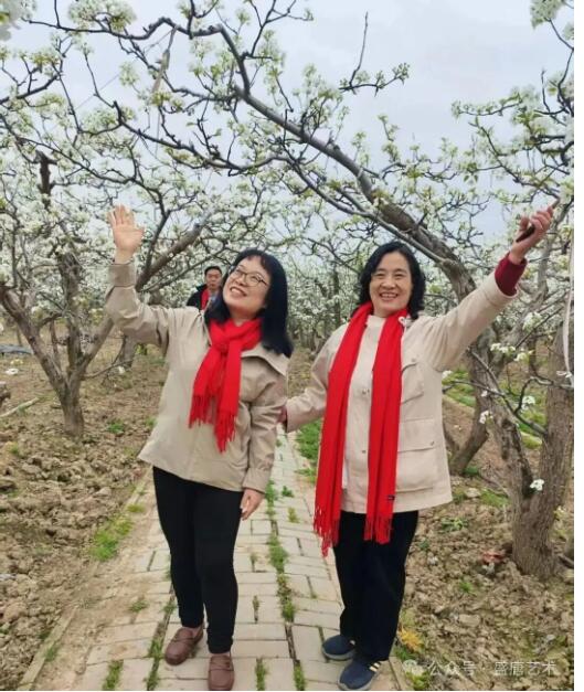 陪同诸位老师现场献艺的时光,处处透着温暖与感动。李养正院长、魏鸿海老师与同行的书画家们,铺纸研墨、落笔行云,笔走龙蛇间,一幅幅苍劲有力的书法、一幅幅雅致灵动的画作跃然纸上。他们俯身书写,耐心为乡亲们题写心仪的字句,把对乡土的眷恋、对百姓的祝福,全都融进一撇一捺、一笔一画之中。围观的乡亲们围在一旁,满眼欣喜与赞叹,接过墨宝的那一刻,脸上洋溢着满满的幸福感,梨园花海间,花香与墨香交织,欢声笑语与笔墨沙沙声相融,这份质朴的温情,让我深受触动。